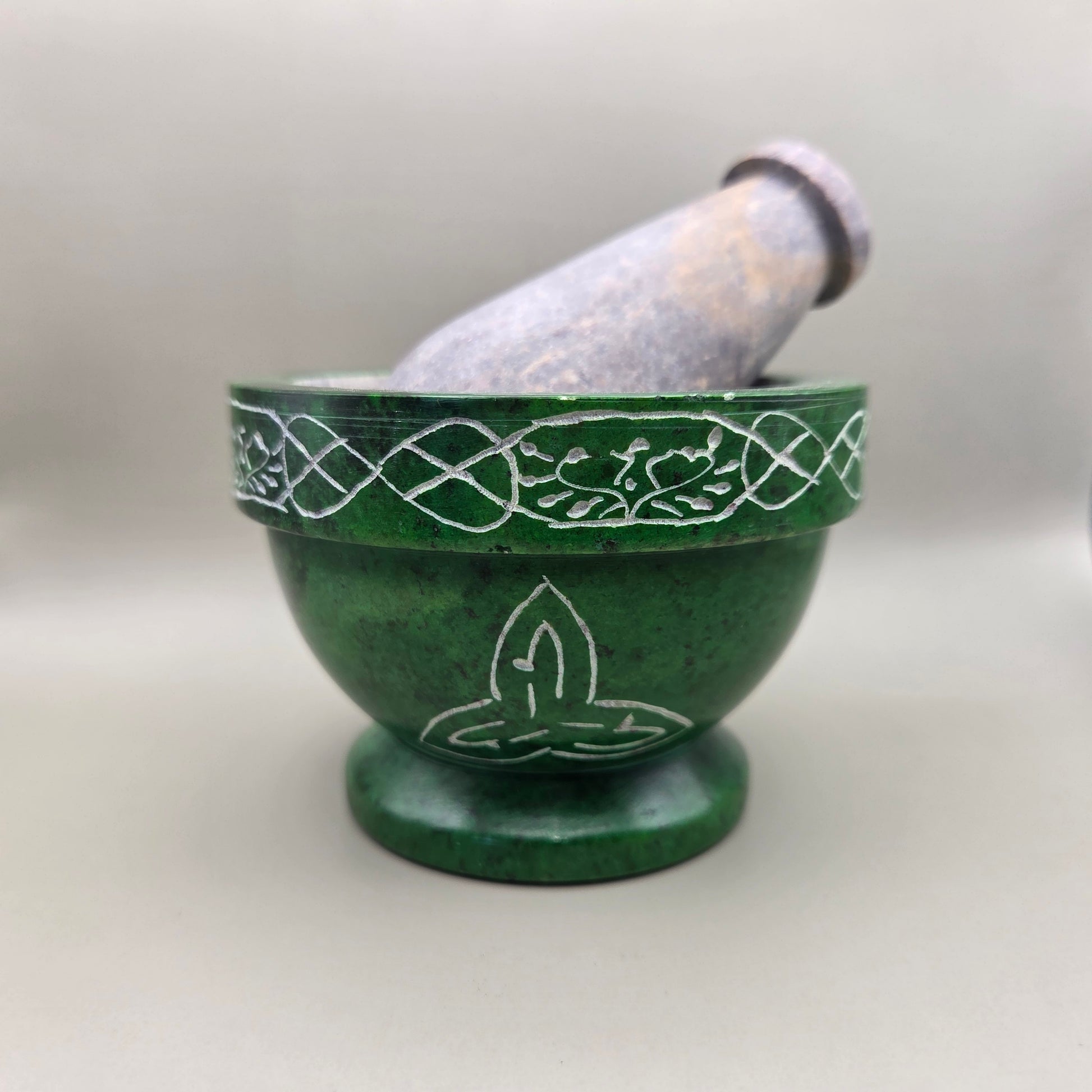 3.5" diameter green soapstone mortar and pestle with carved Triquetra symbol. Remember: Keep separate sets for edible and non-edible preparations to maintain the purity of your magical work. 🌿